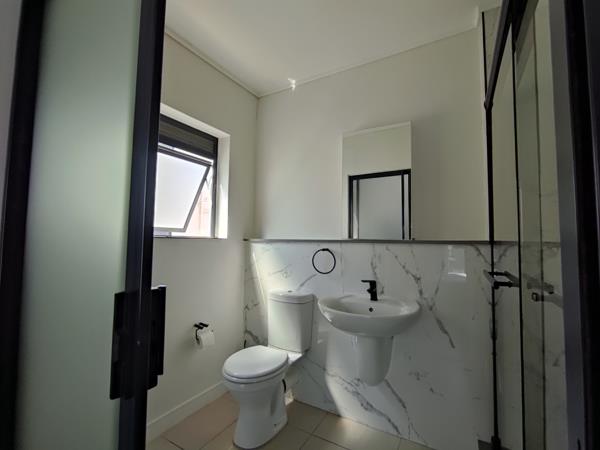 Modern Bathroom: Features a basin, toilet and a spacious walk-in shower with sleek and contemporary design.