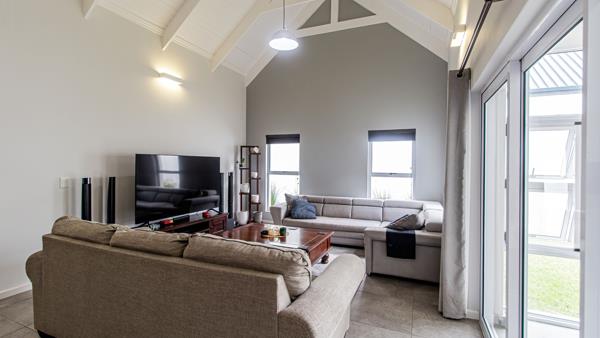 Step inside to a light-filled open-plan living and dining area, seamlessly connected to a contemporary kitchen fitted with quality finishes, ample cabinetry, and a separate scullery. The high-volume ceilings enhance the sense of space, while large sliding doors create effortless indoor-outdoor flow.