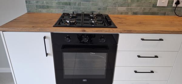 The open plan kitchen is plumbed for both washing machine and dishwasher. Ample cupboard and workspace and sport a gas hob and electric oven combo.