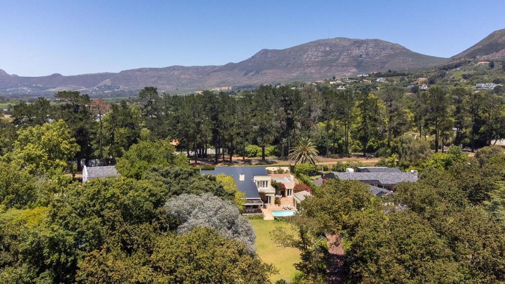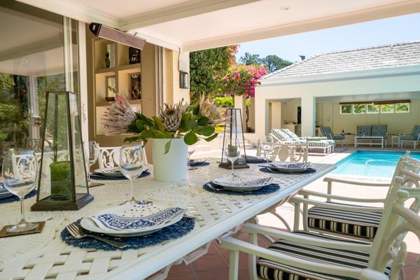 The open plan living areas all open out to a patio, pool and covered braai deck with glorious views of the majestic mountain backdrop behind the beautiful sweeping garden.