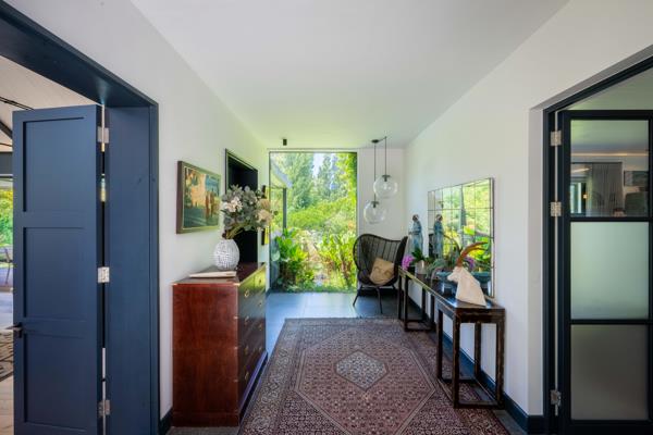 The heart of the home is the open-plan kitchen with scullery, beautifully connected to the dining and lounge area. Here, large glass doors open directly to the garden, creating a space filled with natural light and endless views. A striking double-volume glass feature frames the staircase, with a tranquil pause area at its base a quiet corner to read or simply take in the surrounding beauty.