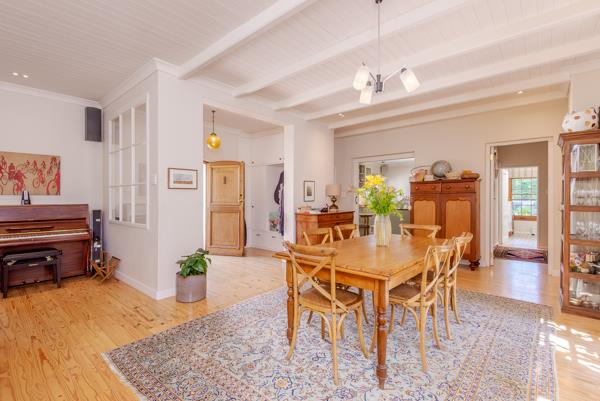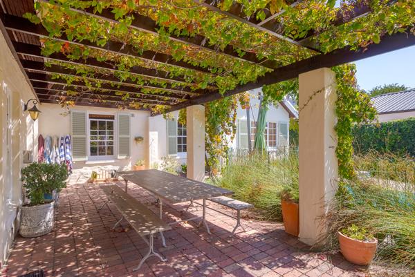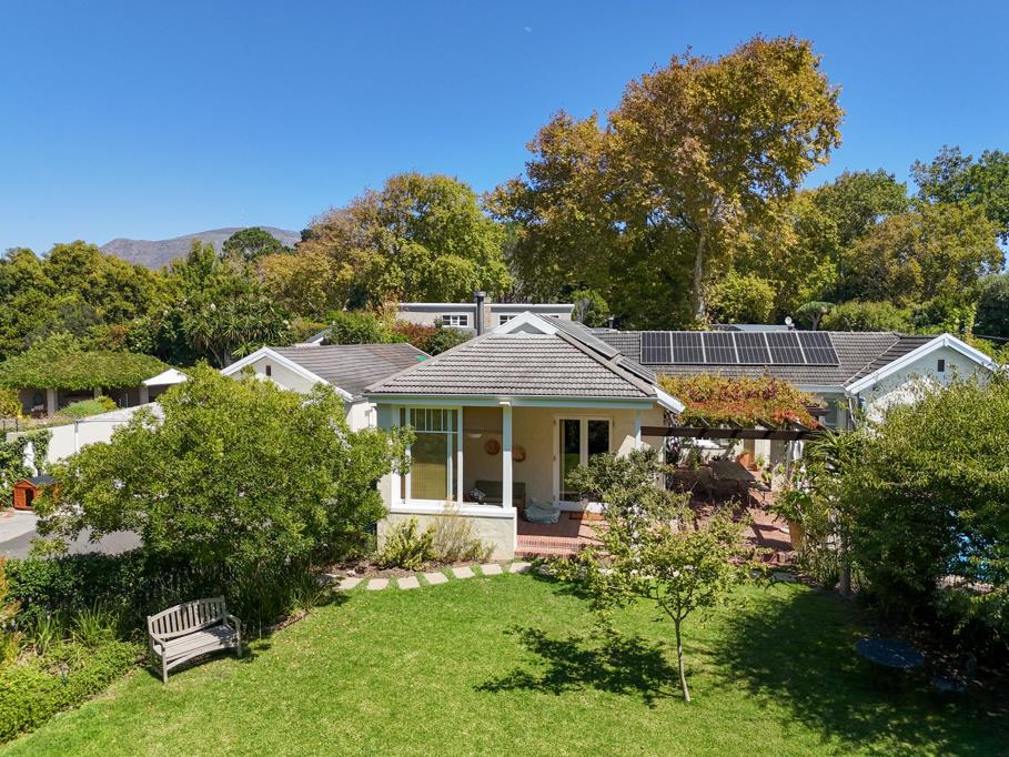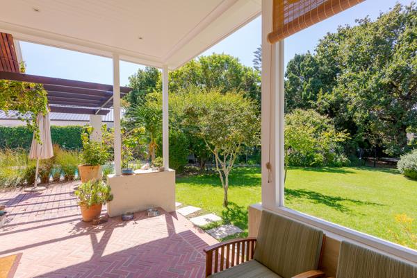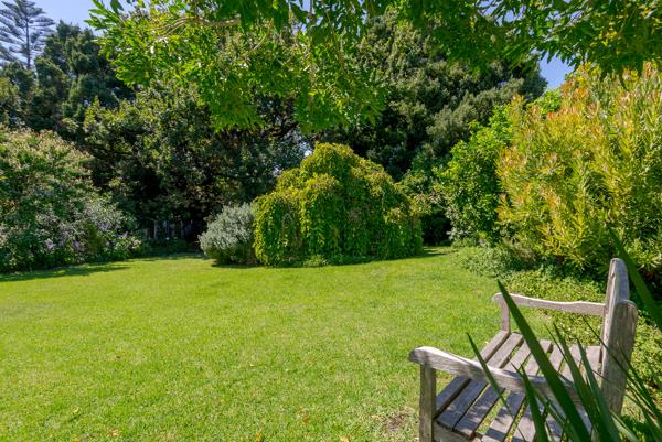 Set on 1,800 sqm of grounds, the home is positioned well back from the road, offering privacy and a sense of tranquillity. A sweeping driveway leads beneath a magnificent old Yellowwood tree, where a shaded childrens play area awaits, complete with a trampoline, playhouse, and jungle gym, all surrounded by mature, established trees that create a beautiful natural setting. Abundant with fruit trees, figs, plums, limes and lemons, this gorgeous garden is borehole fed with computerised irrigation.