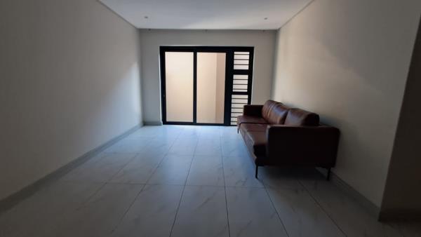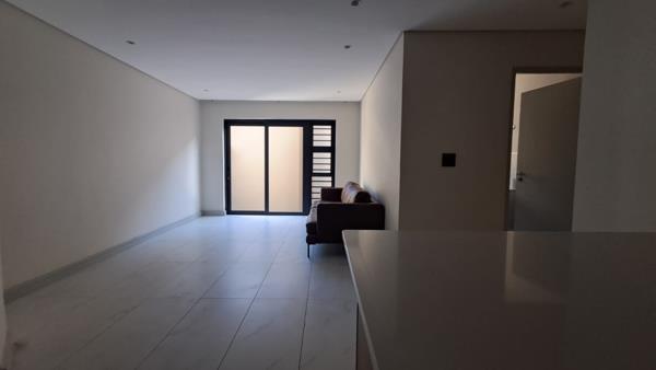 Featuring sleek finishes throughout, the kitchen boasts crisp white countertops paired with warm wooden cabinetry, creating a clean and stylish aesthetic. The spacious lounge flows onto a small elongated outdoor areaideal for fresh air, pot plants, or a compact seating setup.