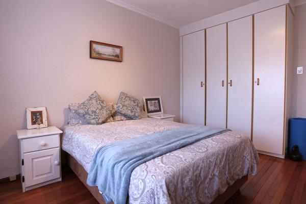 Main bedroom has built in cupboards, curtian rail and wooden flooring.