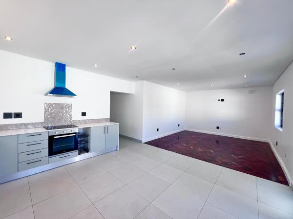 The open-plan living and dining area is beautifully finished and flows seamlessly into the kitchen. The kitchen offers new fitted cupboards, space for a dishwasher and a double-door fridge, and is fitted with a brand-new induction stove and oven. The area is filled with loads of natural light.
