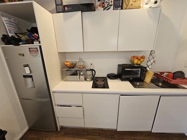 Charming Modernised Studio Apartment comprises open plan built-in Kitchen with two plate stove and fridge.