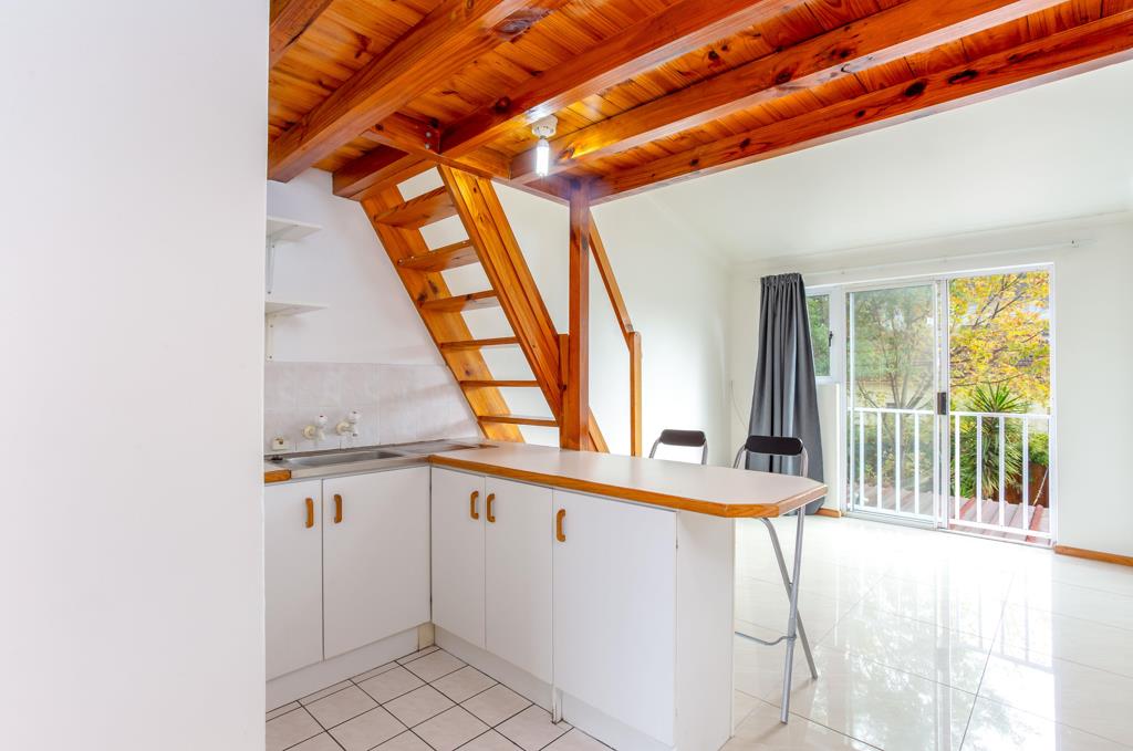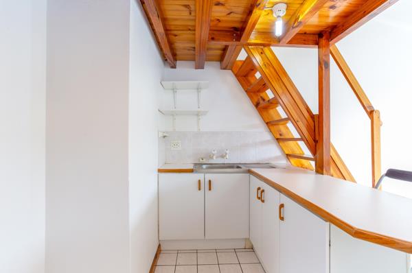 The neat, well-designed kitchen offers ample cupboard space and plumbing for one appliance. Upstairs, the loft-style bedroom provides built-in cupboards and comfortably fits a double bed, creating a cozy retreat with a touch of elegance.