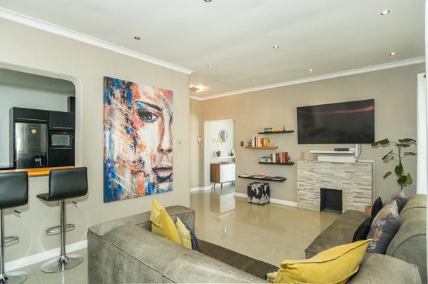 The lounge area comes with a cozy built-in fireplace leading to the open plan dining area which flows to the outdoor entertainment area with built-in braai. The fitted kitchen boasts ample cupboard space, room for 2 appliances plus fridge.