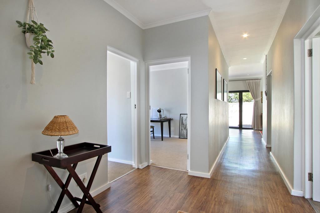 The home offers a spacious and welcoming entrance hall that sets the tone upon arrival. The lounge showcases a fireplace and stack-away doors leading to a wooden deck with an outdoor braai, an excellent space for entertaining. The TV roomdining area seamlessly connects to the same deck, creating a wonderful environment for gatherings.