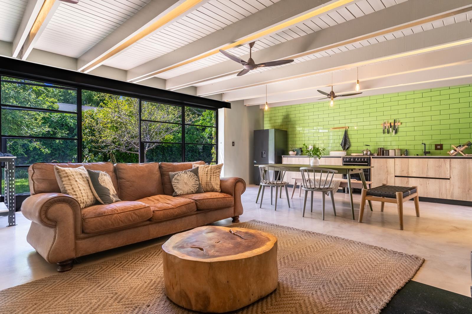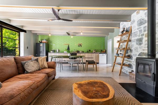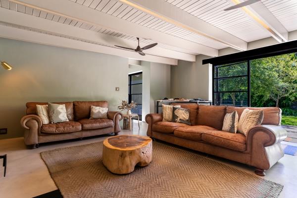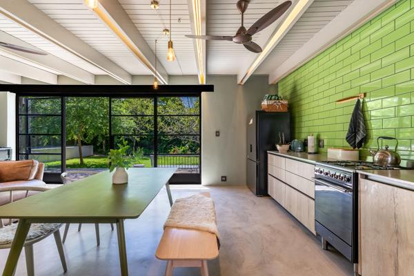 The spacious, sun-filled living and dining area flows effortlessly from indoors to the lush outdoors, ideal for both relaxed family living and entertaining. The innovative open-plan kitchen is equipped with ample cabinetry, a scullery, and a gas stove for the culinary enthusiast.