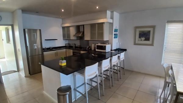The property features three spacious bedrooms, with two of them sharing a private second balcony, and two modern bathrooms. The open-plan living area includes a balcony and a built-in gas braai, complemented by 180-degree panoramic views of False Bay and the Hottentots Holland Mountains. The kitchen is fully equipped with a dishwasher, washing machine, tumble dryer, and fridge. Wi-Fi is included, and there are two secure, covered parking bays for residents.