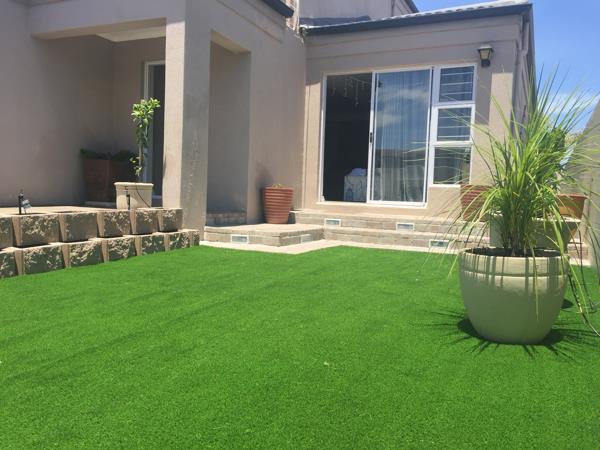 Low-maintenance landscaped garden with braai & water feature