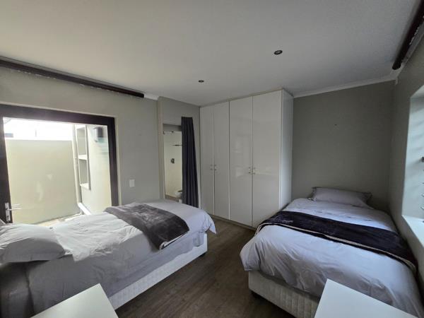 The main suite downstairs offers ample fitted cupboards and sliding doors opening up onto patio and pool fitted with blinds. Lie in bed andamp enjoy the breathtaking vistas or close the shutters and be completely shut off from the world. The open en-suite offers a freestanding slipper bath, toilet, double vanity andamp walk-in shower.