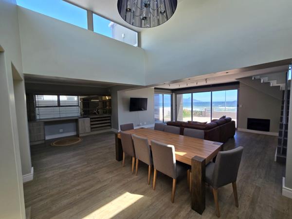 Modern bar open plan to expansive living area with stacking sliding doors opening up to the outside built-in braai area and sparkling pool. The lounge is spacious and open plan and fitted with a fireplace to warm the house on a chilly evening . The dining area offers double volume ceilings with windows, allowing the