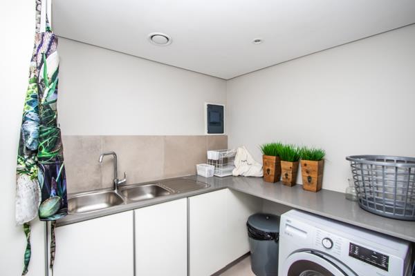 Discover contemporary coastal living in this sophisticated 109 sqm apartment, perfectly situated in Bloubergstrand. This residence features an open-plan layout, seamlessly connecting the living, dining, and kitchen areas, all bathed in natural light from expansive windows. The modern kitchen is a highlight, boasting white cabinetry, light grey countertops, a vibrant blue backsplash, integrated stainless steel appliances, and a spacious island with bar seating. Complementing the main kitchen is a dedicated utility room with a double stainless steel sink and ample storage, enhancing functionality.