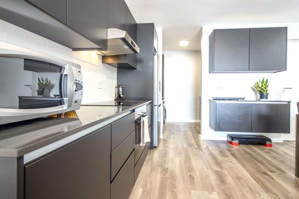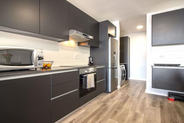 This 2-bedroom unit is completed with built-in cupboards and vinyl flooring. The main bedroom opens up to the balcony airing the unit with the fresh sea breeze. Beautiful view just from here. The family bathroom consists of a walk-in shower, vanity basin and a toilet. The en-suite bathroom with a vanity cupboard, shower and a loo. The living areas are distinctly different in dark granite tops and dark wrapped cupboards. The scullery has a double sink.