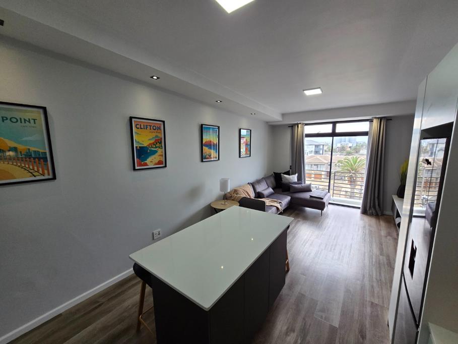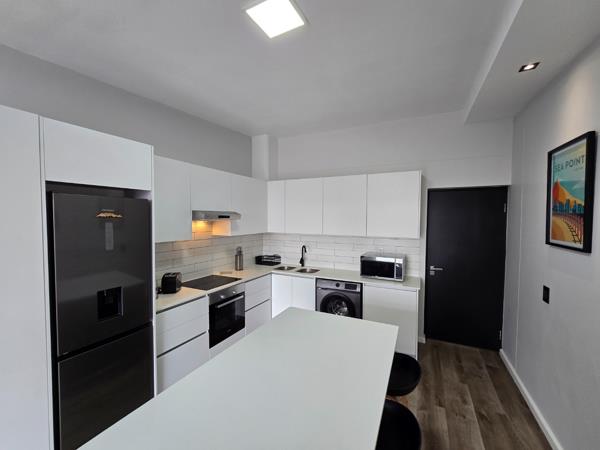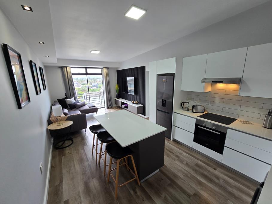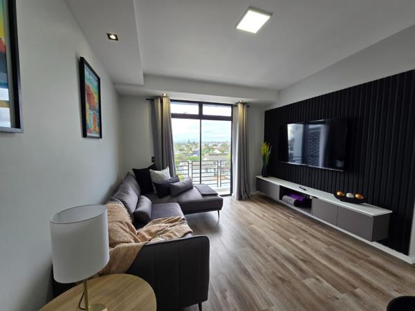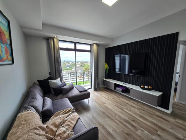 The generous living area boasts a feature wall with elegant wooden paneling and sliding doors that open onto a bright, north-facing balcony. Here you can enjoy breathtaking views across Blouberg towards the Durbanville Hills a perfect spot for relaxing or entertaining guests.