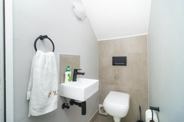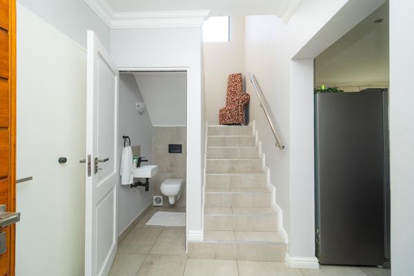 The living area extends to an indoor built-in braai room with sliding doors opening to the outside, making it an entertainers dream, rain or shine! A convenient guest bathroom on the ground floor ensures your visitors feel right at home.