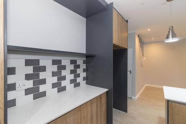 The modern kitchen is fitted with a gas stove, ideal for load-shedding cooking, and includes a separate scullery plumbed for two appliances, offering both functionality and style. Ample cupboard space and a clean, contemporary design make it a joy to cook and entertain in.