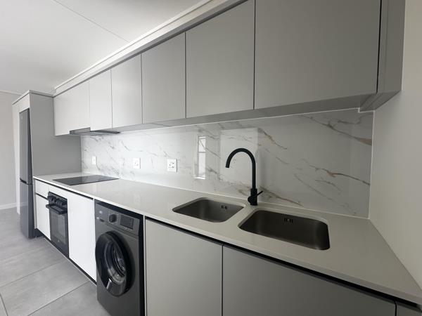 The open-plan living area boasts a modern, fully fitted kitchen flowing into a spacious lounge, with a sliding door opening onto a private enclosed balcony with a view of Table Mountain. Appliances provided include a washing machine, dishwasher, and fridge.