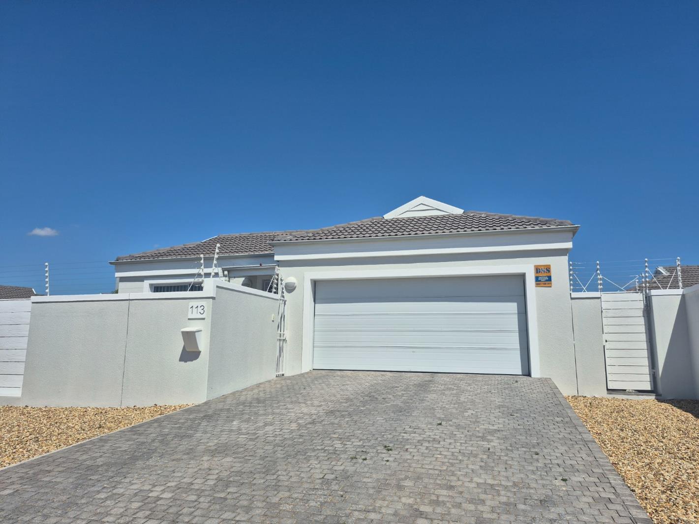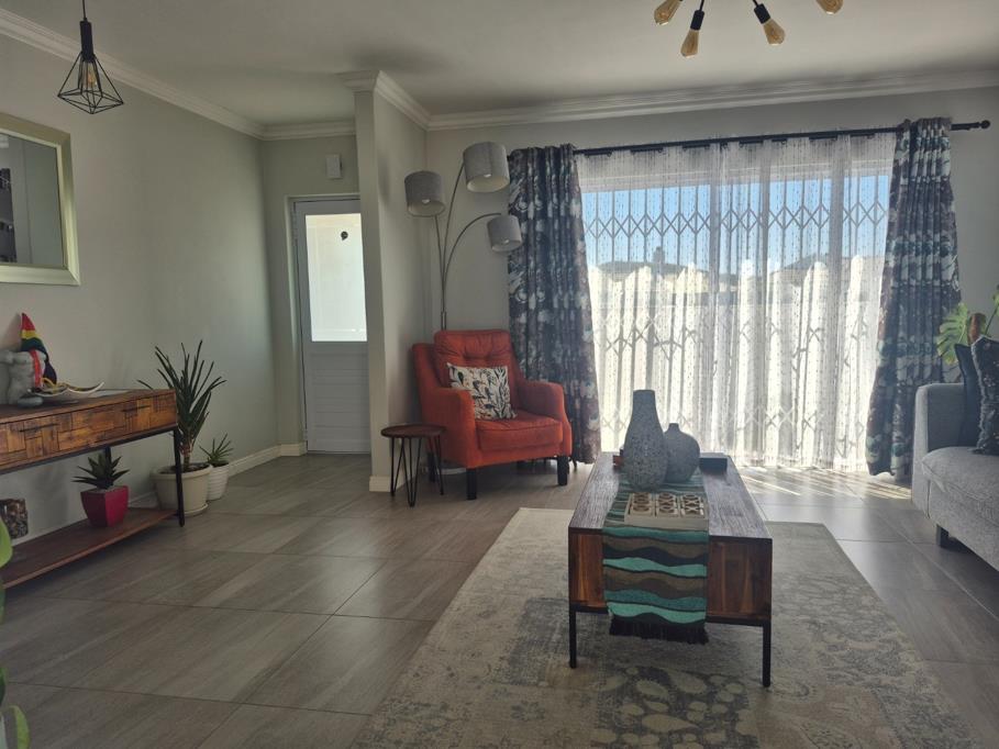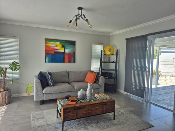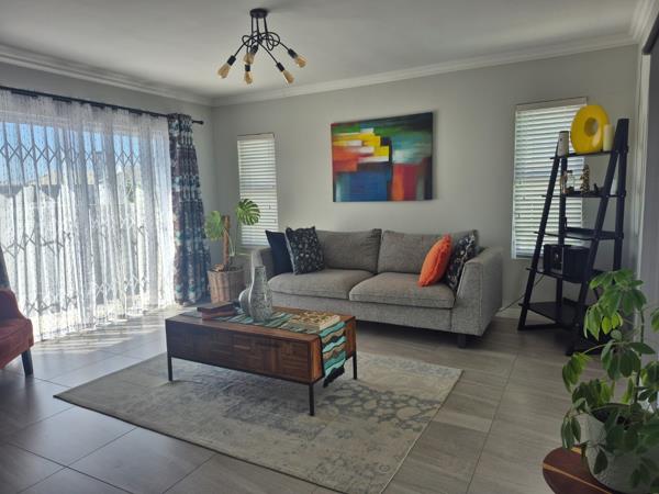This modern 3-bedroom, 2-bathroom home in Sunningdale, Blouberg, offers comfortable suburban living. An inviting entrance hall opens to spacious open-plan living areas, featuring two lounges and a dining room with contemporary tiled flooring and crown molding. The sleek, modern kitchen boasts white cabinetry, light countertops, a separate pantry, and an island/breakfast bar, ideal for daily life and entertaining. Large windows and sliding doors ensure abundant natural light.