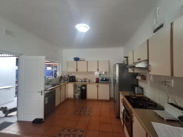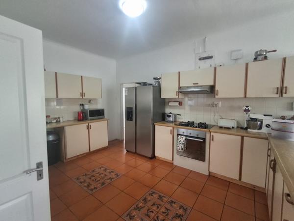 Spacious tiled lounge with fireplace and fitted airconditioner. The diningroom is open plan to a huge farmstyle kitchen with ample built-in cupboards and fitted with gas hob, oven and extractor fan. Plumbing for two appliances and kitchen door leading to entertainment room / bar area.
