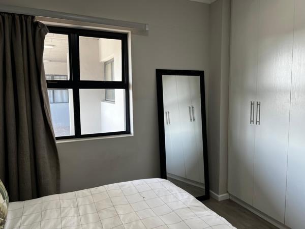 The apartment features an open-plan lounge and dining area with a sliding door that opens onto a balcony, offering excellent city views. The modern kitchen provides space for a washing machine or dishwasher, and includes a stove and extractor fan. For your convenience, the home is fiber-ready for fast, reliable internet and features prepaid electricity and water for easy usage control. The property is located within a secure, pet-friendly lifestyle estate with 24-hour manned security.