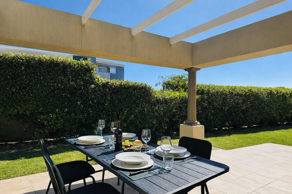 A peaceful patio with a dining set and pergola lets you enjoy morning coffee or quiet evenings surrounded by greenery.