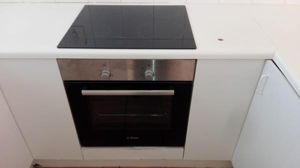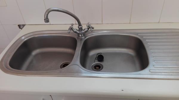 The Kitchen is tiled, it has a stove, double sink, place for a washing machine or dishwasher, is a comfy size with ample built in white cupboards.