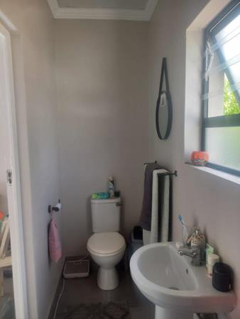 Bathroom with a toilet, basin and shower.