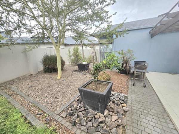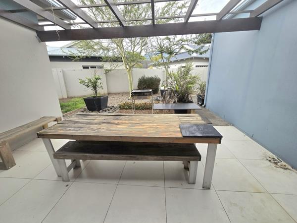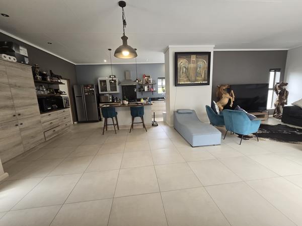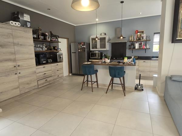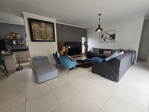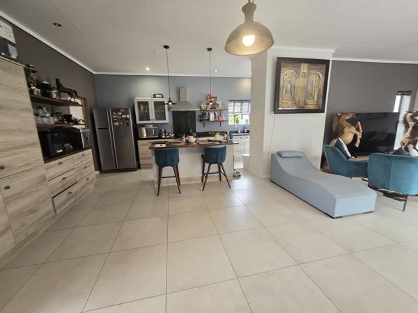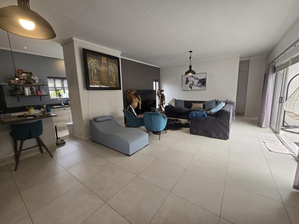 This residence features a generous open-plan living, dining, and kitchen area. Sliding doors from the living space open onto a secluded patio, perfect for enjoying evening sundowners with friends.