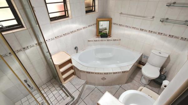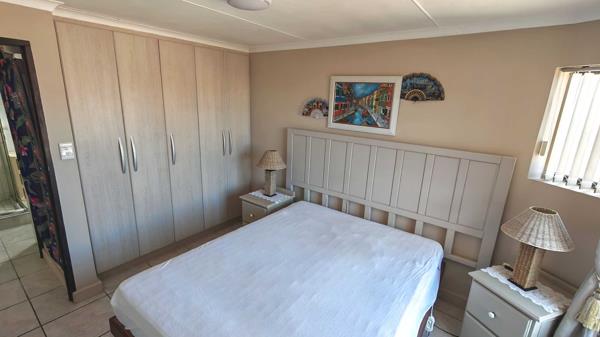 Main bedroom with extra-long queen-sized bed and built-in cupboards. The second bedroom has two single beds with imbuia furniture. Both bedrooms are serviced by one full bathroom with a large oval bath and shower. Open plan lounge area with a TV and two couches. Outside Braai.