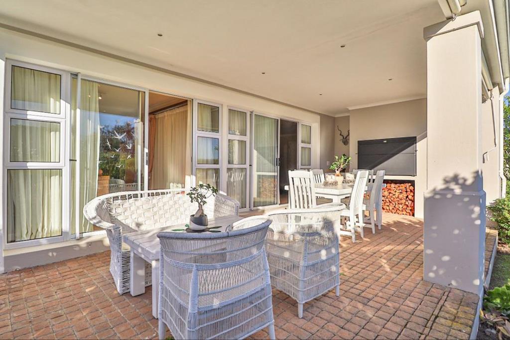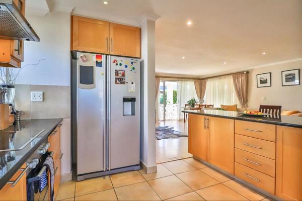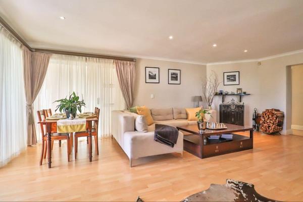 The spacious open-plan lounge and dining area features a built-in fireplace and opens onto a covered patio with a built-in braai and roller blinds perfect for year-round entertaining.