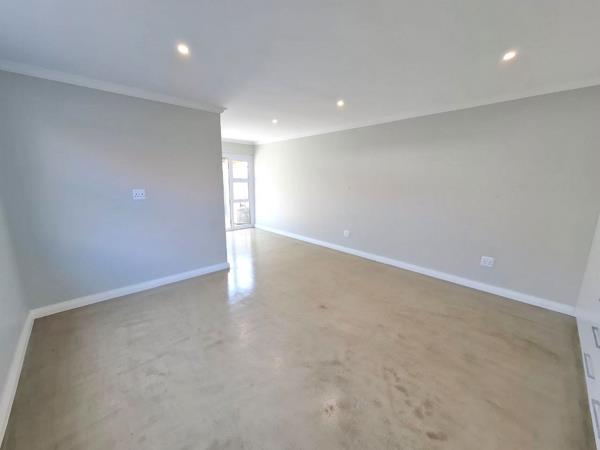 Newly build flat in Reebok. Lovely modern two-bedroom, 2.5 bathroom unfurnished apartment in Reebok with stunning views of the ocean. Laundry, one bedroom with en-suite downstairs, and open plan kitchen & living area with inside braai, bedroom with en-suite & guest toilet upstairs.