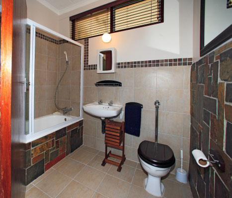Natural light fills the space, with balcony access providing scenic water and distant mountain views. The bathroom boasts a distinctive natural slate accent wall. Ideal for a lock-up-and-go lifestyle, security is ensured by a secure gated entrance, burglar bars, and a security gate.