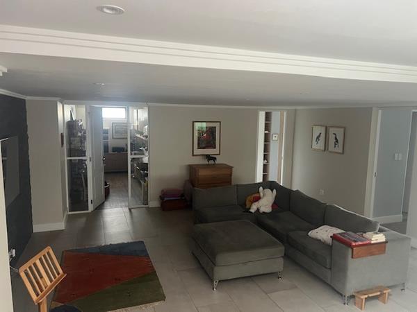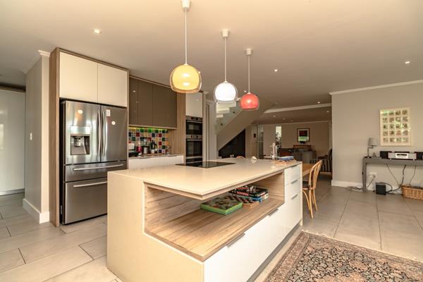 This exceptional furnished rental property in Knysna Heights offers a sophisticated and comfortable living experience. Boasting three spacious bedrooms, each with its own en-suite bathroom, plus a convenient guest toilet, this home is designed for modern living. The interior features two inviting lounges and a dedicated dining room, all adorned with contemporary tiled flooring, neutral wall colours, and recessed lighting, creating a bright and versatile atmosphere. Elegant crown molding adds a touch of refinement, while the open-plan design enhances the flow between living spaces. A sleek, light-coloured staircase with glass railings and integrated lighting serves as a striking architectural feature, connecting the levels seamlessly.