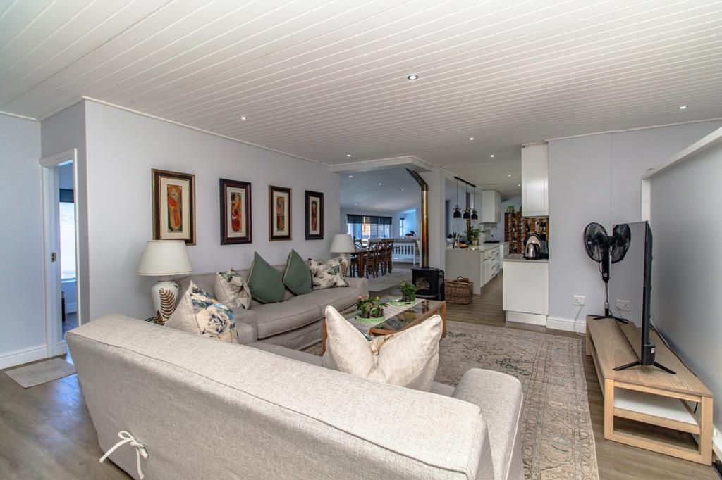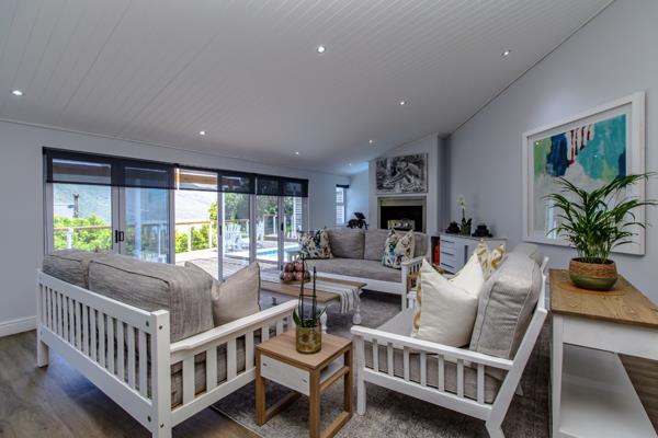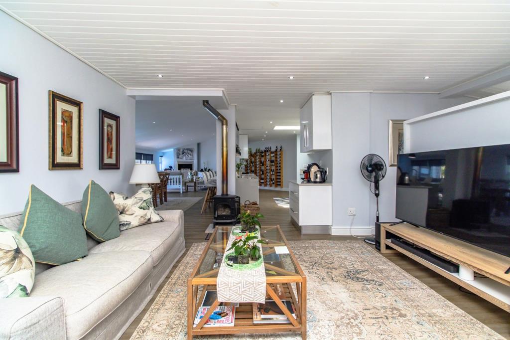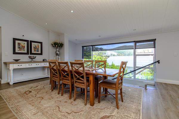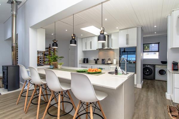 Discover an exceptional rental opportunity in the prestigious The Heads, Knysna. This modern, fully furnished residence offers a spacious 350 sqm floor plan, designed for comfortable living and entertaining. The property features four well-appointed bedrooms, each with its own en-suite bathroom, plus an additional guest toilet, ensuring privacy and convenience for all occupants. The interior boasts a bright, open-plan layout with two inviting lounges, a dedicated dining room, and a contemporary kitchen. The kitchen is a highlight, equipped with a large island, breakfast bar seating, sleek white cabinetry, modern appliances, and enhanced by pendant lighting and a skylight. Throughout the home, you''ll find stylish wood-look flooring, recessed lighting, and distinctive paneled or slatted ceilings, creating a sophisticated ambiance.