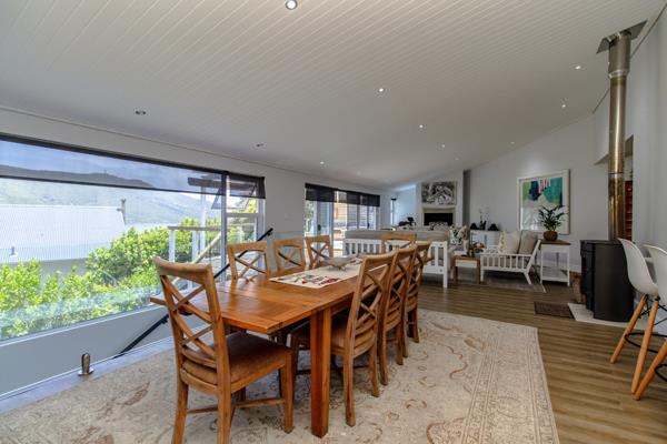 Designed for a relaxed lifestyle, this holiday home seamlessly integrates indoor and outdoor living. Large sliding glass doors connect the living areas to an expansive deck and patio, perfect for enjoying the stunning panoramic views of the turquoise bay and lush mountains. A refreshing pool offers a private oasis, while an indoor braai provides year-round entertainment options. For cooler evenings, both a wood-burning stove and a fireplace add warmth and character. Practical amenities include a dedicated laundry area and ample storage.