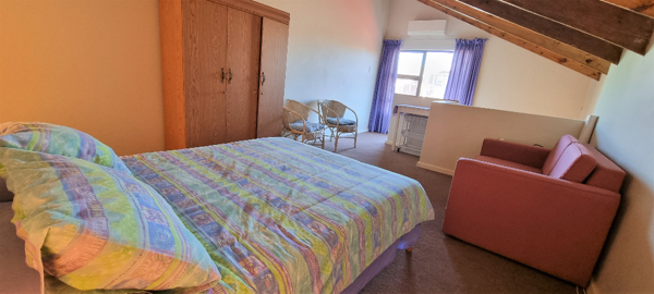 Upstairs is a spacious bedroom with double bed and enough space for a lounge set.