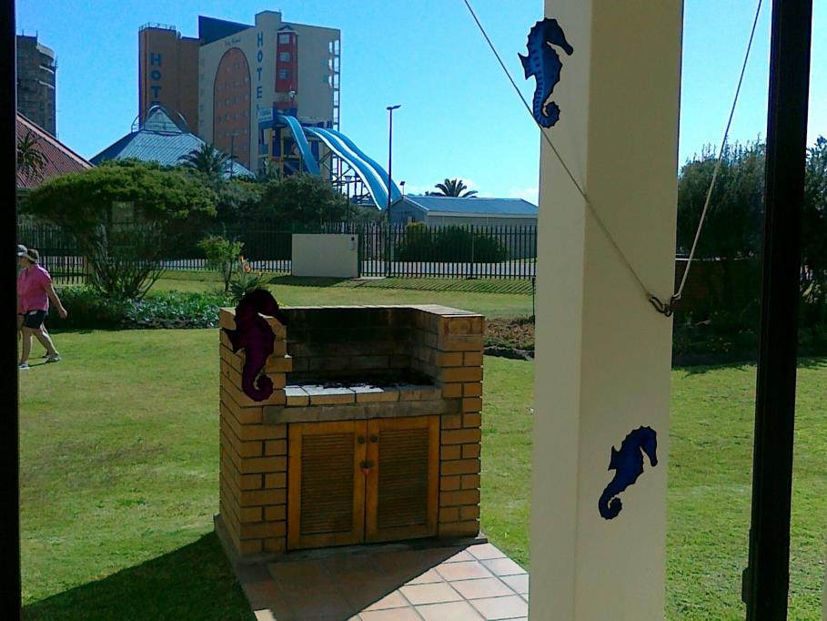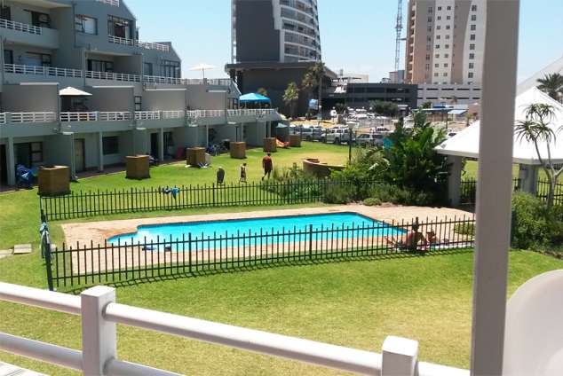 Ground floor two bedroom apartment sleeping four people. A must have for the holiday, pool in the garden with a braai. Walking across the road to the Diaz Hotel, the beach and Waterpark.