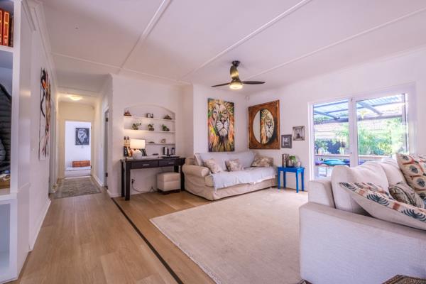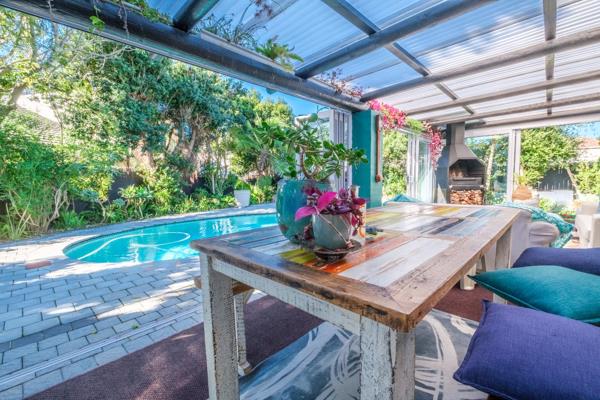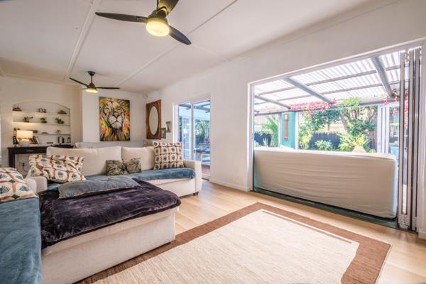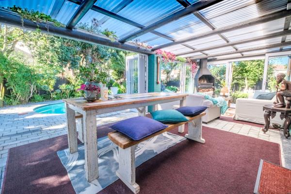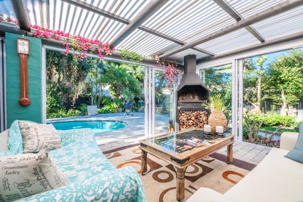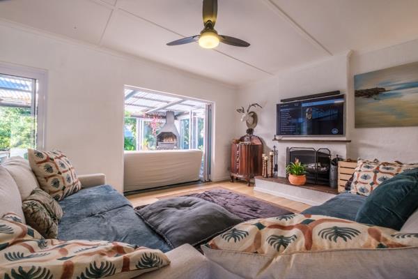 Enjoy the light open-plan living areas with TV lounge, enclosed patio with a built-in wood braai, lounge and dining table seating 6. This leads out onto the Pool, Garden and Braai area.