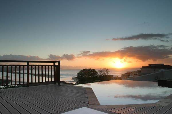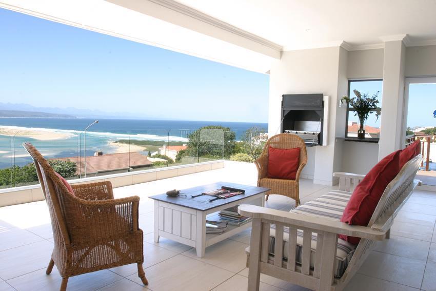 Doors lead to the Decked Pool Area with large Sun Umbrella, two Sun-Loungers and chlorinated Rim-flow Pool with stunning views of the Lagoon, Sea, Beach and Tsitsikamma Mountain Range.