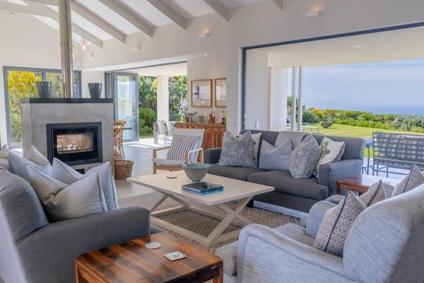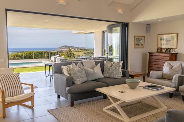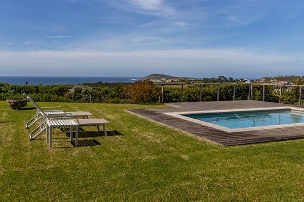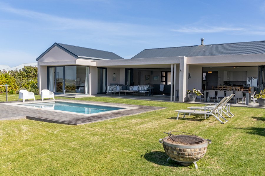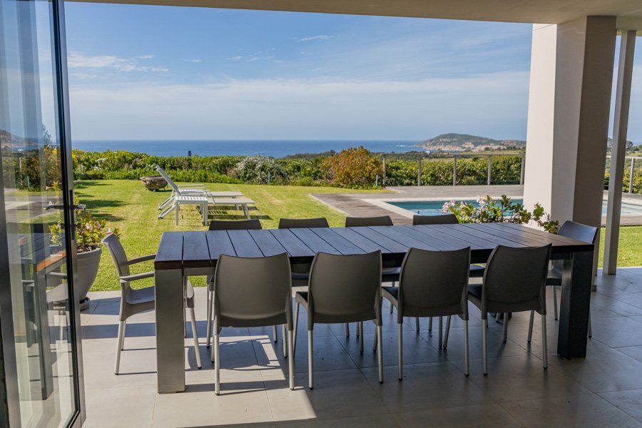 Large glass stacking doors open onto the covered patio outdoor dining table seating up 10 with gas weber braai and fire-pit overlooking the pool and views of the sea.
