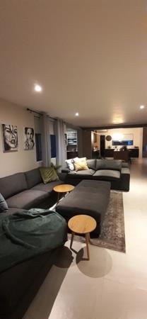 * TV Lounge with modern L shaped Lounge Suite. Smart TV with Netflix and basic DSTV.