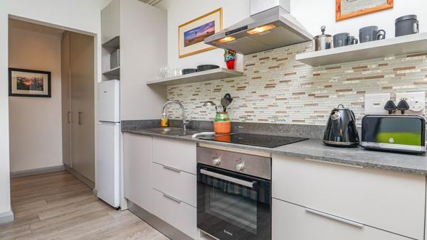 Kitchenette with oven, stove, extractor, fridge and microwave