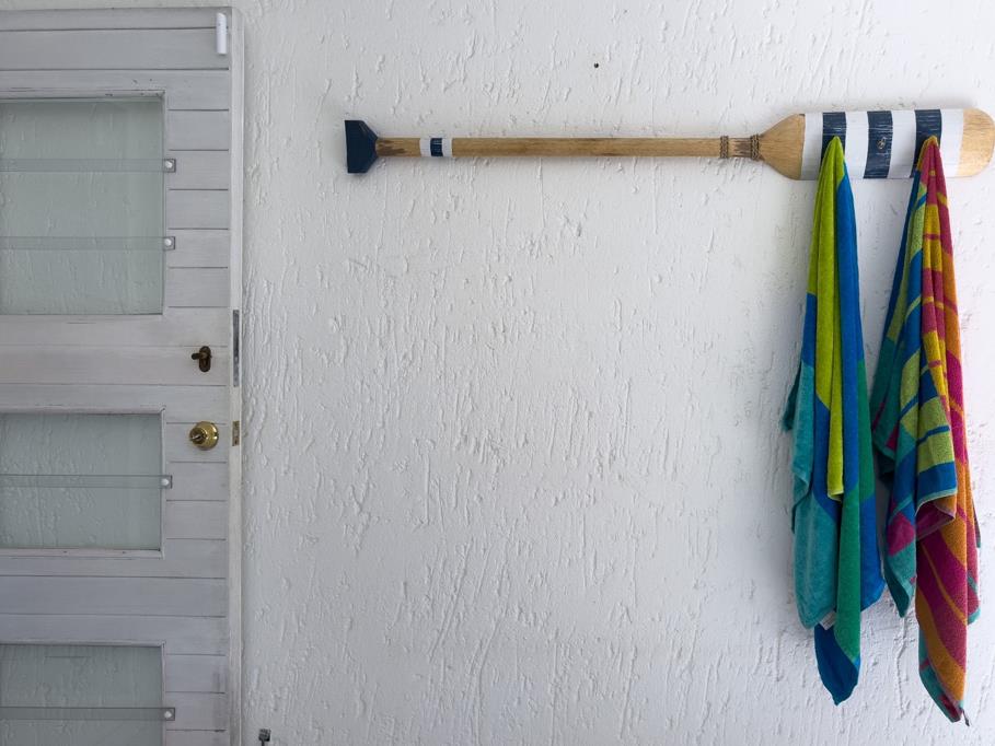 Spacious laundry with linen cupboards, separate area with washing machine, laundry sink, doors open to the drying courtyard.