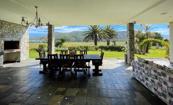Large wrap around Balcony with stunning views over the River and Country setting, Seating Areas along the Balcony, Dining Table and Chairs seating 8 People, lovely Lounge Area, large Built in Braai, Pizza/ Bread Coal Oven.