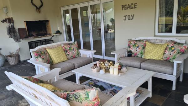 Large covered, Patio/ Entertainment Area with a large Built in Braai, Dining Table and Chairs, Lounge Area, lovely views over the Garden and Swimming Pool, Doors that stack open.