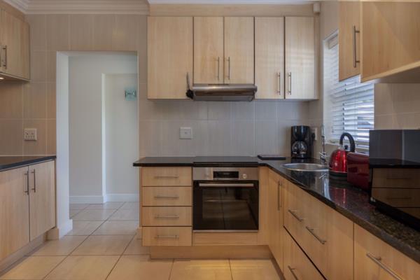 The apartment has open plan living areas with a gas fireplace in the lounge for those cold winter nights. The living area opens up onto an undercover patio area (with a built in steel braai) where you can enjoy sundowners at sunset and watch breath-taking beautiful moon rises over the river and hills. In the morning you can wake up to sounds of fish eagles calling and enjoy your coffee while watching springbok roaming freely in the estate pronk and play. The well-equipped kitchen is a chefs dream with all well know appliances one needs to prepare a feast, with a separate scullery and laundry that leads onto an enclosed outdoor drying area.