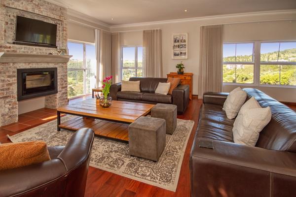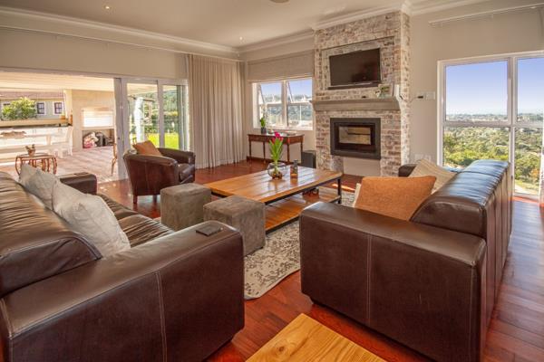 Open plan spacious lounge with comfortable leather sofas, TV with smart box, full DSTV and Netflix, fireplace, doors open